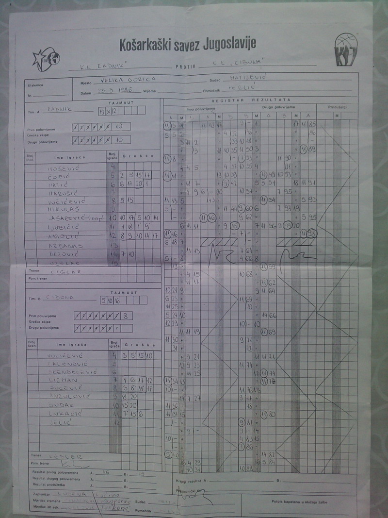 Zapisnik s juniorske košarkaške utakmice KK “Radnik” iz Velike Gorice protiv KK “Cibona” iz Zagreba od dana 25.03.1985. godine. Cibona je pobijedila Radnik 99 : 98 a igrač s najviše postignutih koševa bio je igrač KK “Radnik” iz V. Gorice Mirko Ljubičić koji je postigao 69 koševa, od čega 17 trica (16x3 i 1x2+1) što je jedno vrijeme bio svjetski rekord u broju potignutih trica na jednoj utakmici.