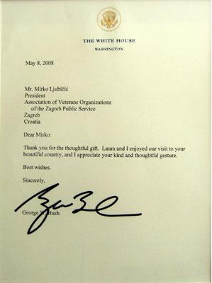 Predsjednik Zajednice udruga branitelja Zagrebačkog holdinga mr. sc. Mirko Ljubičić primio je od predsjednika Sjedinjenih Američkih Država i velikog prijatelja Hrvatske, njegove ekscelencije George W. Busha, pismo zahvale povodom poklon majice: